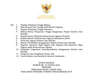 Konstan.co.id – Menteri Agama (Menag) Yaqut Cholil Qoumas menerbitkan Surat Edaran Nomor SE. 15 Tahun 2022 tentang Perayaan Natal Tahun 2022 pada Masa Pandemi Corona Virus Disease 2019. Surat Edaran yang diterbitkan pada tanggal 19 Desember 2022 tersebut memberikan rasa aman dan nyaman kepada masyarakat dalam menyelenggarakan Perayaan Natal Tahun 2022 serta untuk mencegah, menanggulangi, dan memutus mata rantai penyebaran COVID-19.